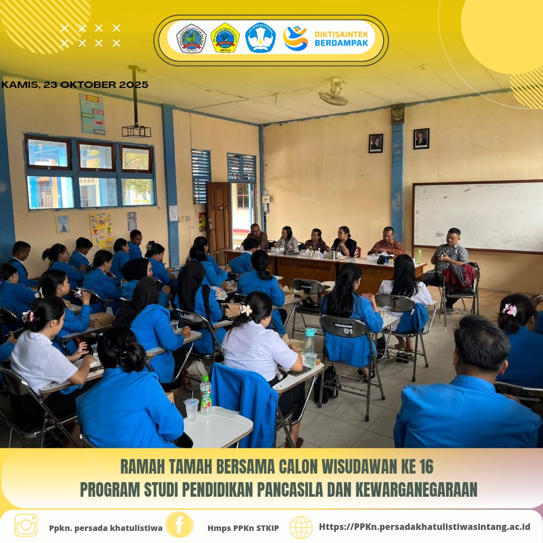 Pada hari Kamis, 23 Oktober 2025, Program Studi Pendidikan Pancasila dan Kewarganegaraan (PPKn) STKIP Persada Khatulistiwa Sintang melaksanakan kegiatan Ramah Tamah Bersama Calon Wisudawan ke-16. Kegiatan ini berlangsung di Ruang C.101–102 dalam suasana penuh kehangatan dan kebersamaan.
