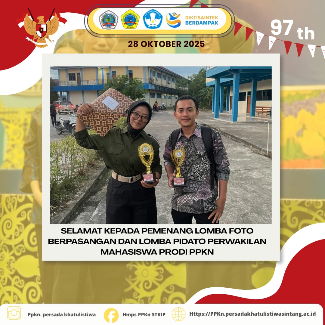 Selamat disampaikan kepada perwakilan mahasiswa Program Studi PPKn yang telah menunjukkan dedikasi dan semangat juang tinggi dalam mengikuti perlombaan tersebut. Partisipasi ini mencerminkan jiwa muda yang kreatif, berani, serta memiliki komitmen kuat untuk terus berkontribusi dalam mengembangkan nilai-nilai kebangsaan dan karakter generasi muda.